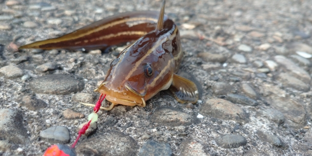 夜釣りで最も遭遇率が高いのが、ナマズを小さくしたような魚「ゴンズイ」です。 茶色い体に黄色い縞模様があり、ヒゲが生えているのが特徴です。「ゴンズイ玉」と呼ばれるボール状の群れを作るため、一匹釣れると連続して釣れることがあります。