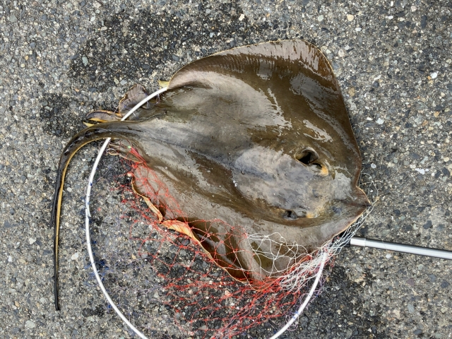 海底(ボトム)付近を狙っていると、強烈な引きとともに座布団のような物体が上がってくることがあります。これが「アカエイ」です。