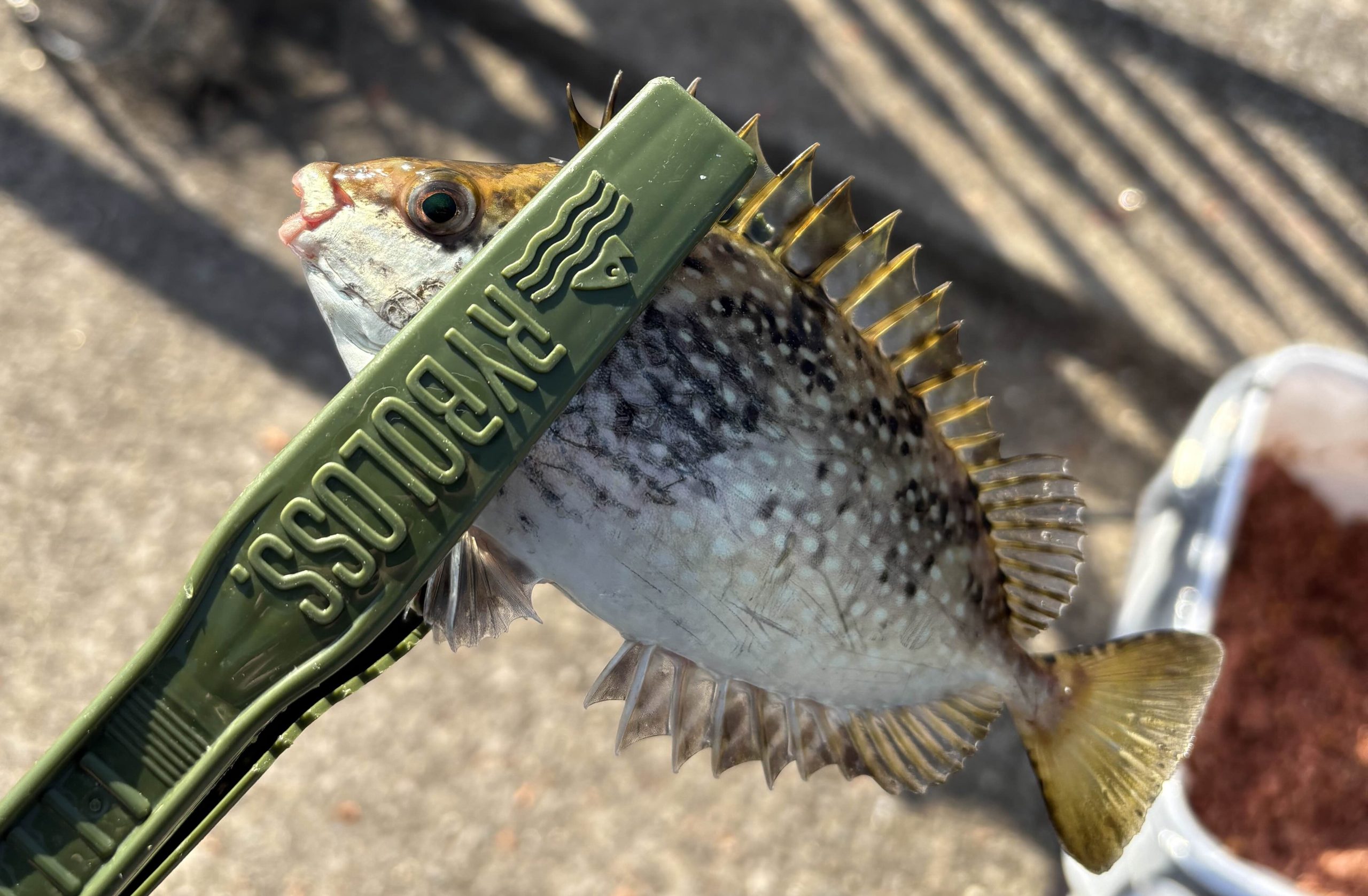 この魚の厄介な点は、背びれ・腹びれ・尻びれのほぼ全てのトゲに毒があることです。さらに、釣り上げるとビチビチと激しく暴れ回るため、針を外そうとした瞬間に手に刺さる事故が多発しています。美味しい魚ですが、初心者のうちは無理をせず、写真のように魚ハサミで挟み、プライヤーなどで針を外してリリースするのが無難です。